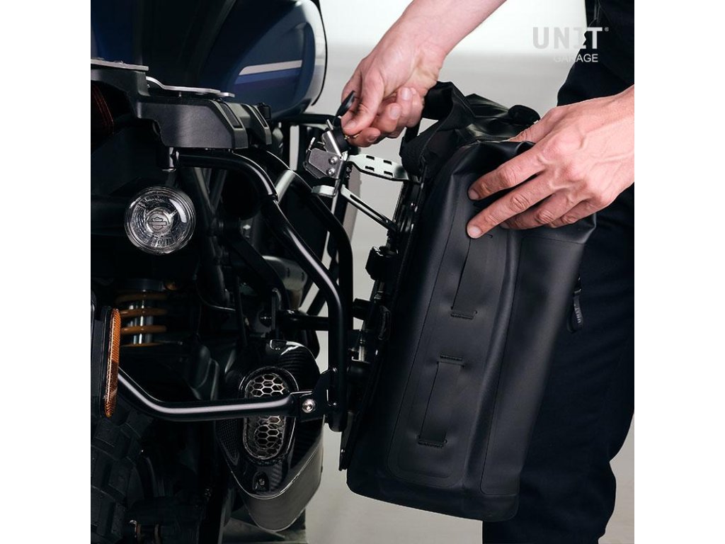 Brašny jsou ze strany motocyklu vybaveny hliníkovou plotnou, která má uzamykatelný systém pro upevnění na nosiče UNIT garage a různé jiné typy nosičů.