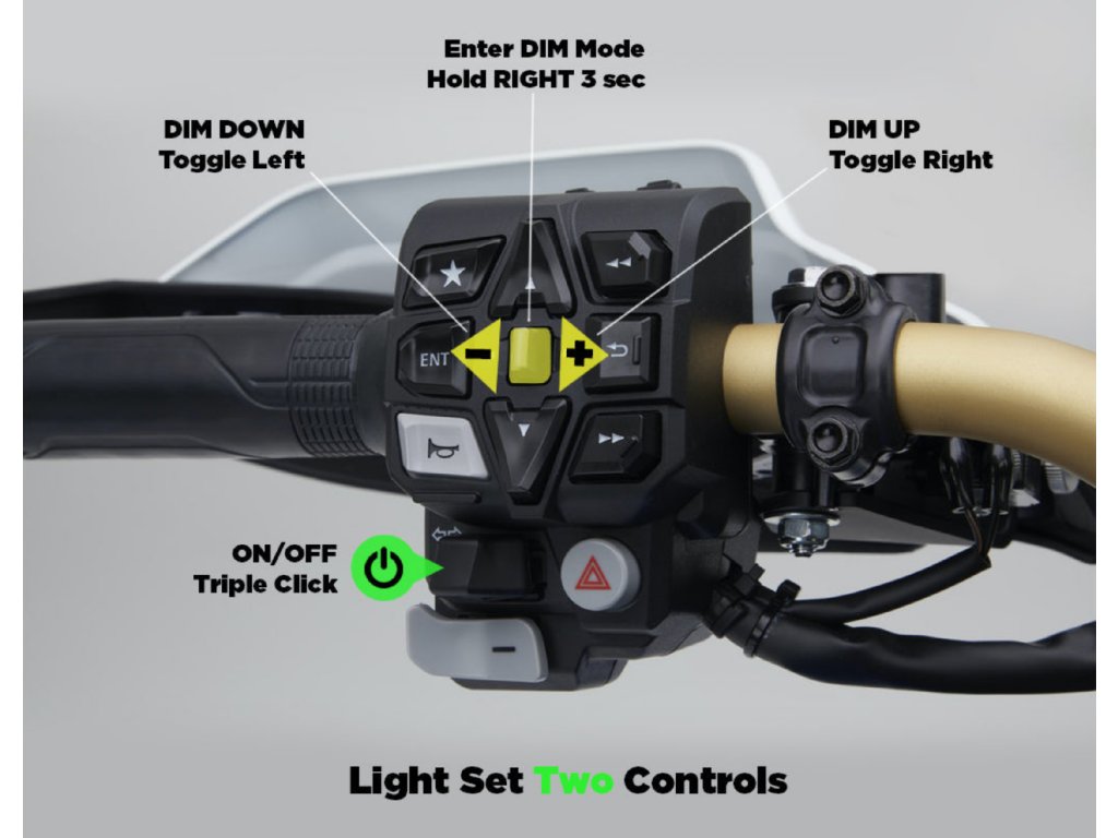 ON/OFF a ztlumení – nezávislé zapínání/vypínání a změna intenzity dvou sad světel (denní/noční režim) přímo z originálních ovladačů motocyklu.