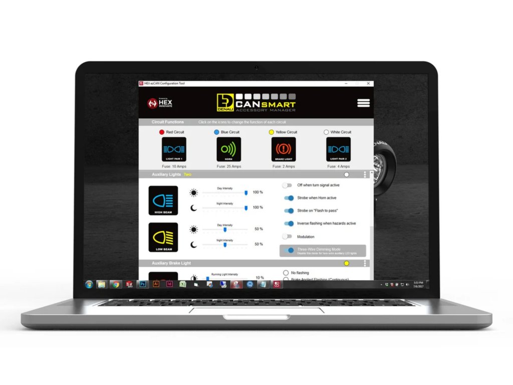 Čtyři výstupy jednotky CANsmart™ jsou přednastaveny pro nezávislé ovládání dvou sad světel DENALI, klaksonu SoundBomb™ a pomocného brzdového světla B6.