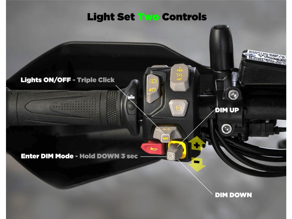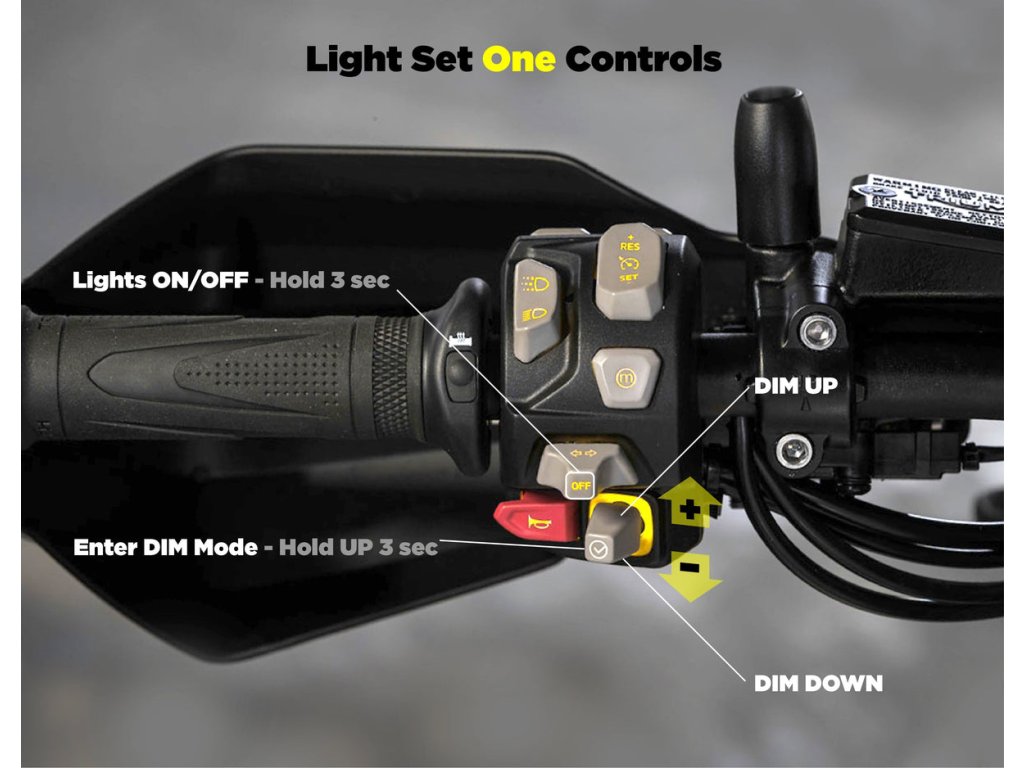 Zapnutí/Vypnutí a stmívání – Nezávislé ovládání dvou sad světel (zapnutí/vypnutí) a změna jejich intenzity (pro denní i noční režim) přímo pomocí originálních ovladačů motocyklu.