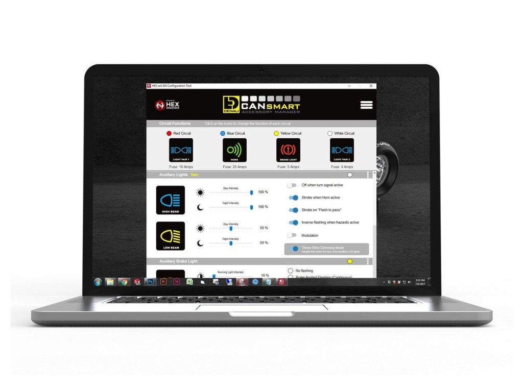 Čtyři okruhy CANsmartu jsou předprogramovány pro připojení a nezávislé ovládání dvou sad světel DENALI 2.0, klaksonu SoundBomb a našeho přídavného brzdového světla B6.