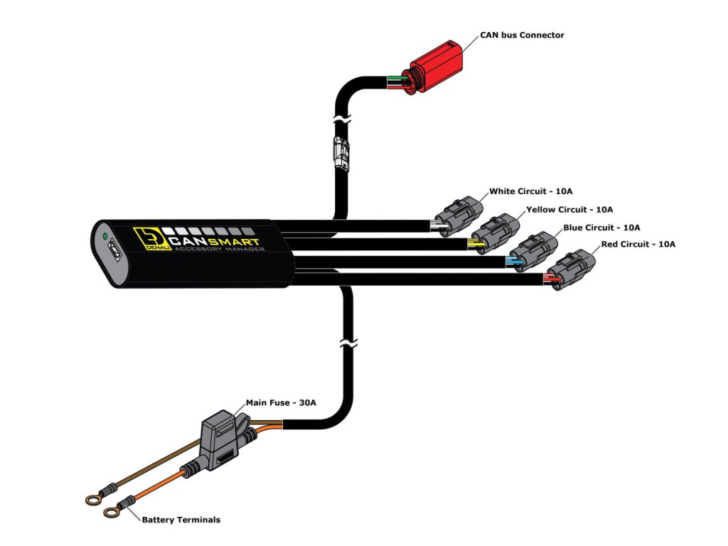 Harley-Davidson CANbus ovladač poskytuje plug & play připojení a inteligentní řízení originálních i neoriginálních doplňků Harley-Davidson přímo z původních ovladačů motocyklu nebo pomocí softwaru DENALI Accessory Manager. Jednoduše připojte CANsmart™ Controller k diagnostickému portu Harley-Davidson a získejte přístup k více než 35 programovatelným nastavením příslušenství, která umožňují inteligentní ovládání přídavných světel, klaksonů, brzdových světel nebo jakéhokoli jiného příslušenství, které si dokážete představit. Čtyři okruhy příslušenství mají elektronické jištění a poskytují až 25 špičkových ampérů (10 ampérů trvale).