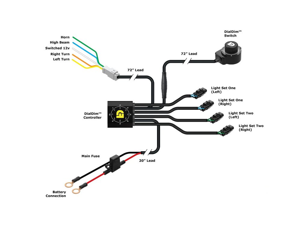 Vaše doplňková světla se automaticky přepnou mezi vámi vybraným ztlumením a plnou intenzitou při aktivaci dálkových světel. Stačí připojit modrý vstupní vodič k okruhu dálkových světel vozidla pro aktivaci této funkce. -