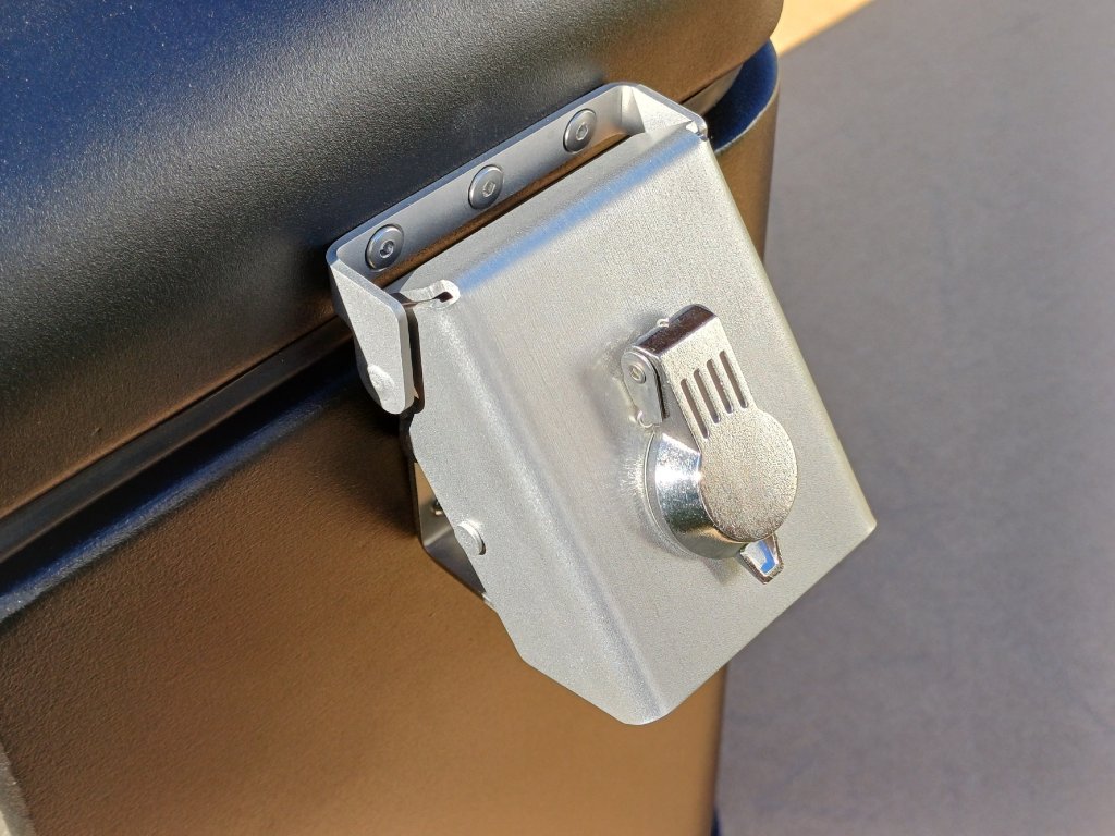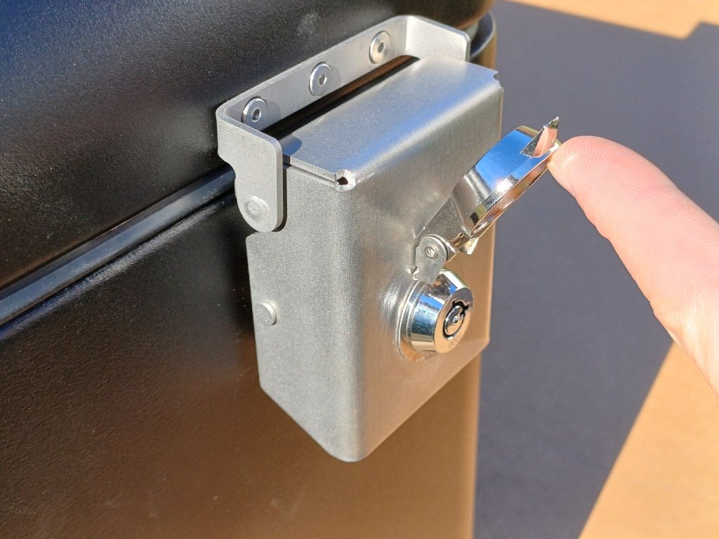 - Ovládání jedním klíčem - uchycení kufru k nosiči i víko kufru mají stejný zámek. Kufr je možné zavřít a vyndat klíč, aniž by musel být uzamčen (pro jízdu však doporučujeme kufr uzamykat)