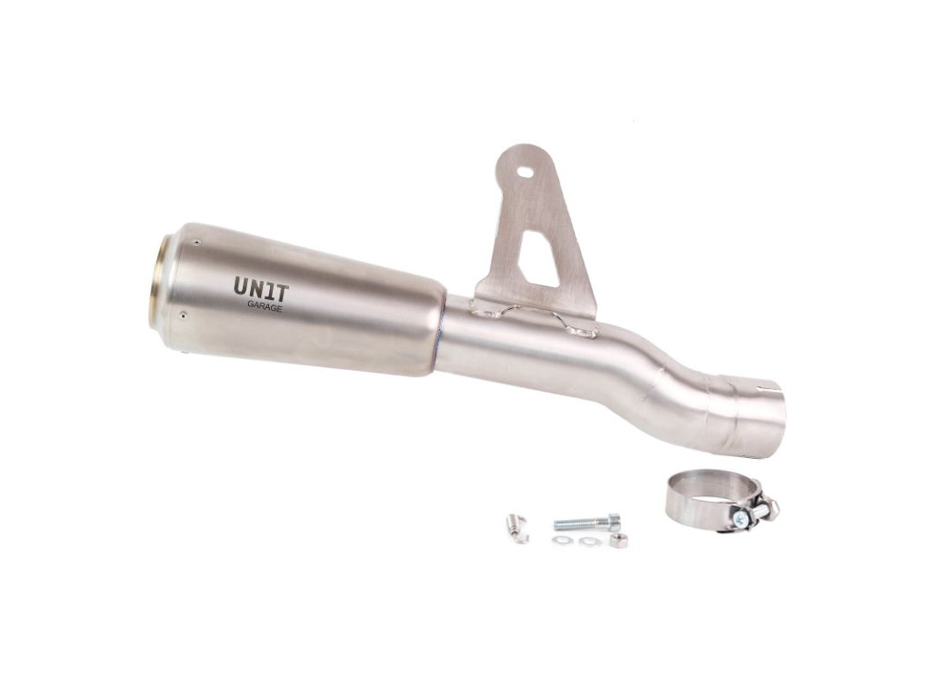 Homologovaný tlumič je vyroben z titanu s nerezovým svodem. Lze jej namontovat na originální svody, přičemž výfuková klapka i katalyzátor zůstávají zachovány, nebo jej lze kombinovat se závodními svody UNIT garage bez katalyzátoru. Instalace nevyžaduje přemapování řídicí jednotky ani žádné další úpravy.