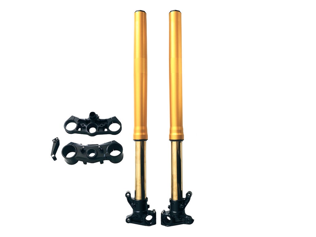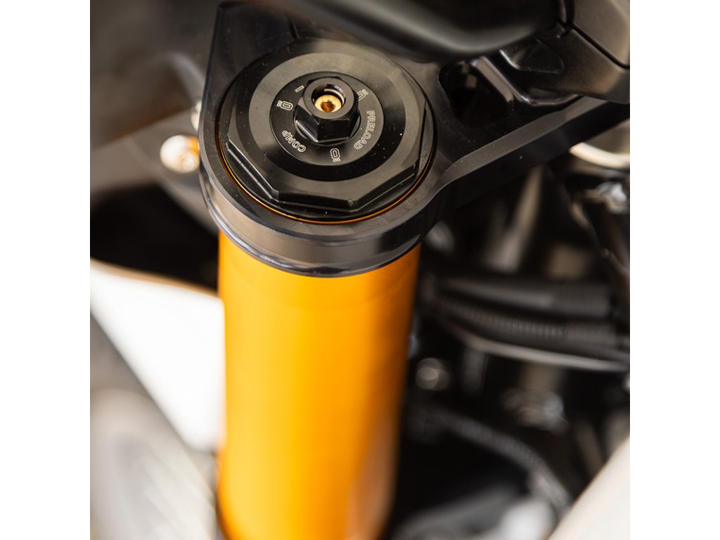 Vidlice s technologií Öhlins Nix 30 je plně nastavitelná v kompresi, odskoku a předpětí pružiny a je vybavena zlatě eloxovanými kluzáky s povrchovou úpravou TIN.
