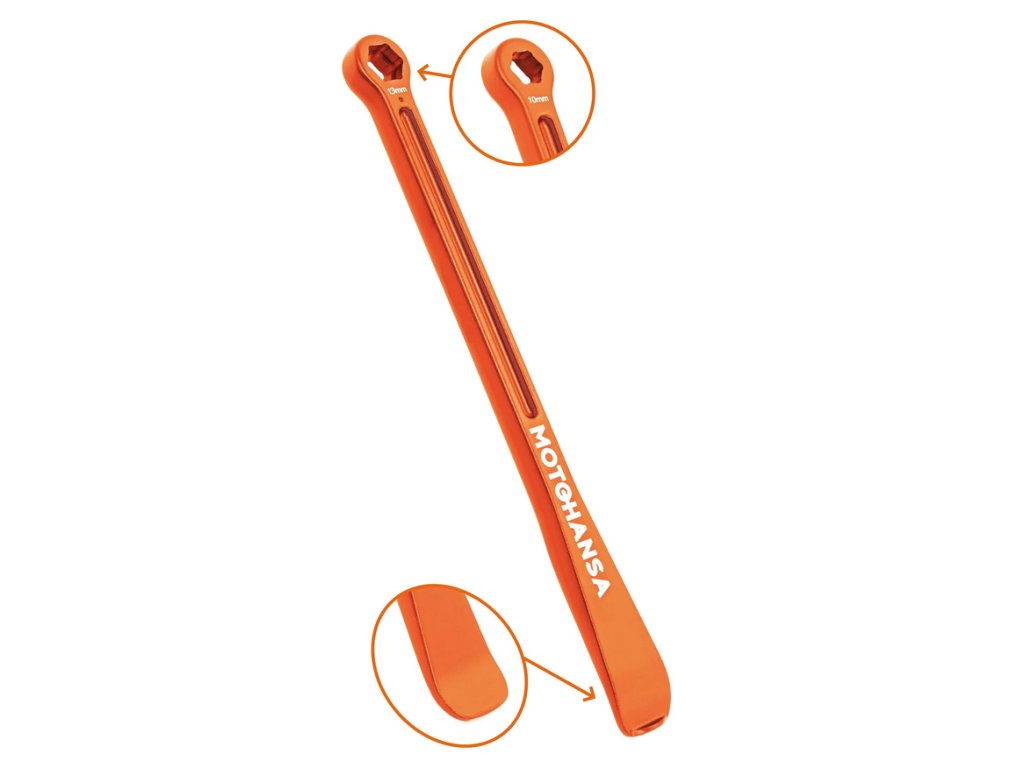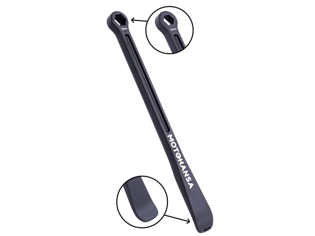 Kompaktní a extrémně silná páka na pneumatiky, navržená pro motorkáře, kteří potřebují spolehlivý nástroj pro výměnu pneumatik na cestách.