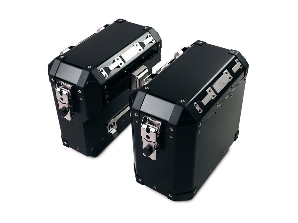 Sada hliníkových kufrů včetně nosičů pro BMW R1300 GS. Kufry 36+40 nebo 41+47 litrů s rychloupíním, vnitřním polstrováním neoprenem a snímatelným víkem. Černé nebo stříbrné nosiče.