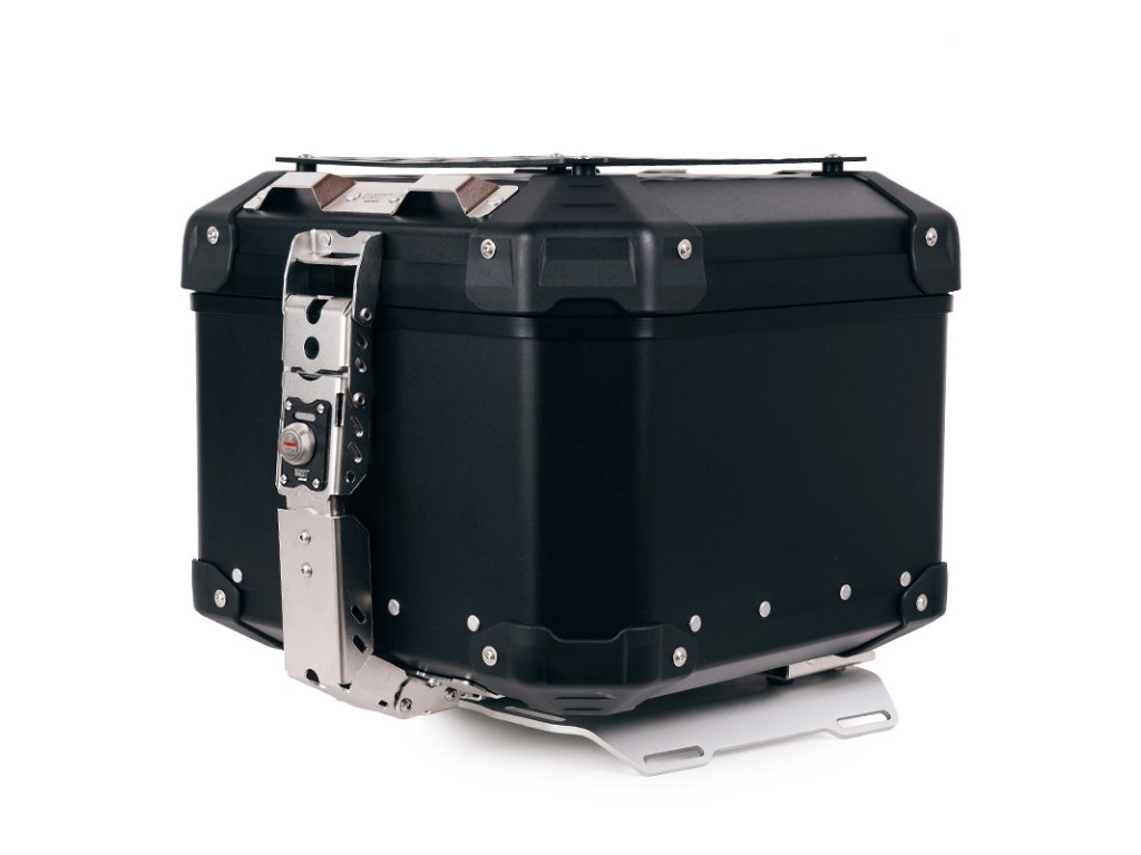 Univerzální top case UNIT garage včetně plotny s rychloupínacím mechanismem (černá / stříbrná). Plotnu lze instalovat na různé nosiče.